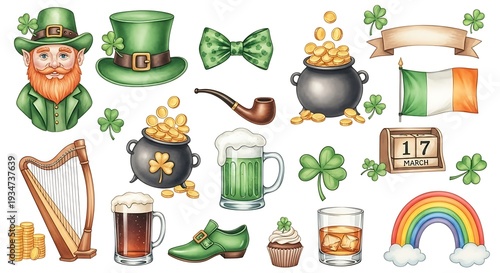 Fototapeta premium A collection of St. Patrick's Day illustrations featuring leprechaun, shamrocks, and Irish symbols