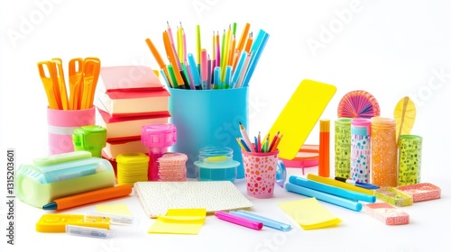 Fototapeta premium A collection of study guides, highlighters, and sticky notes on a white isolated background