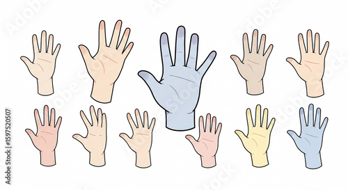 Obraz premium A collection of stylized, diverse hand illustrations, showcasing various skin tones and sizes.