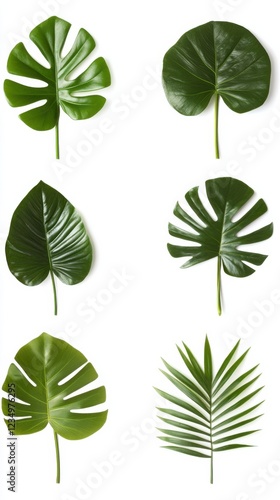 © Sergey, Fototapeta premium A collection of tropical plant leaves against a white background, featuring various shapes and sizes, showcasing the lush green color and texture of each leaf.
