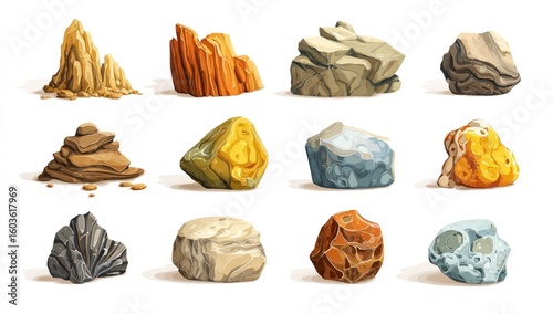 Naklejka premium A collection of twelve diverse rock formations and stones, each exhibiting...