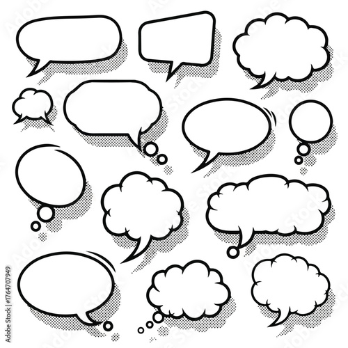 Fototapeta premium A collection of various cartoon speech bubbles and thought clouds on a clean white background with drop shadows.