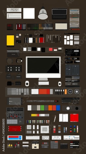 © bcendet, Naklejka premium A collection of various flat design icons for user interface elements, including buttons, sliders, menus, and more.