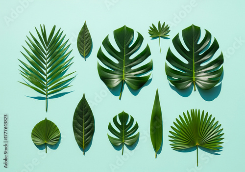 © designX, Fototapeta premium A collection of various green tropical leaves arranged in a pleasing pattern on a solid light blue background, showcasing different shapes and textures