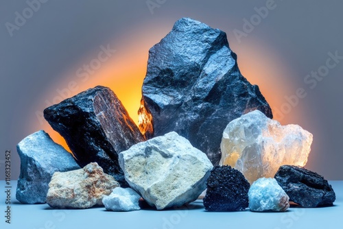 Naklejka premium A collection of various rocks and minerals illuminated by a warm light,...