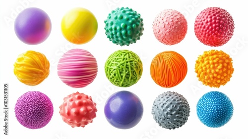 Fototapeta premium A collection of various soft and tactile sensory balls in a range of vibrant colors and different geometric textures arranged in a still life composition on a plain white background