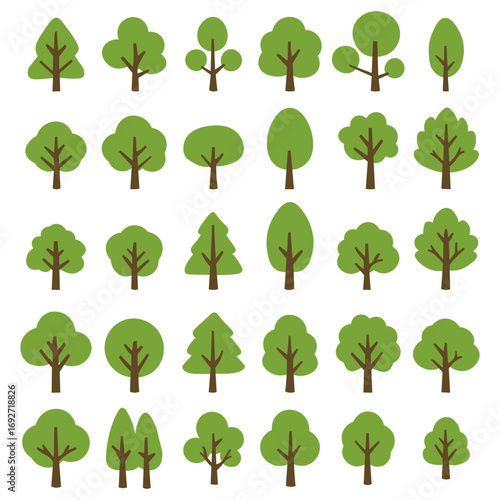 © AEEOSS, Fototapeta premium A collection of various stylized green trees with brown trunks, presented in a grid format.