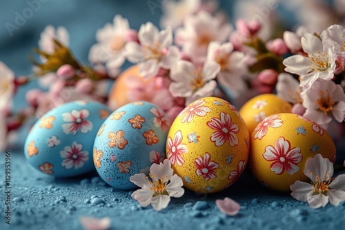 © Fotograf, Fototapeta premium A collection of vibrant Easter eggs arranged on a blue surface