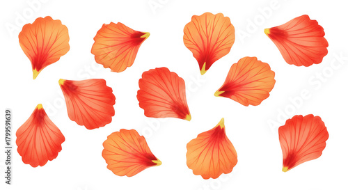 Obraz premium A collection of vibrant orange flower petals scattered across a white background, perfect for floral designs and artistic creations