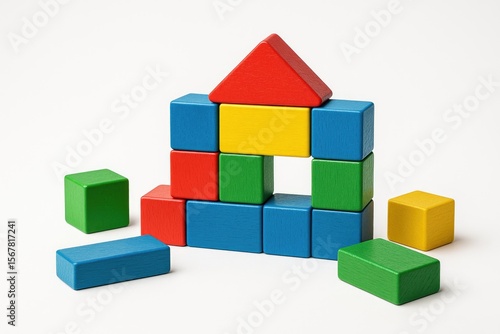 Obraz premium A collection of vibrant wooden building blocks on a plain white surface