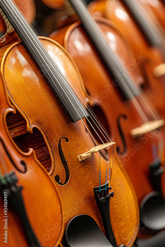 Fototapeta premium A collection of violins, each with a polished wooden finish, is elegantly...