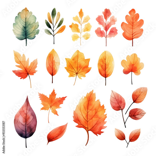 Obraz premium A collection of 18 watercolor autumn leaves in various colors and shapes, perfect for crafting, scrapbooking, and digital design projects.