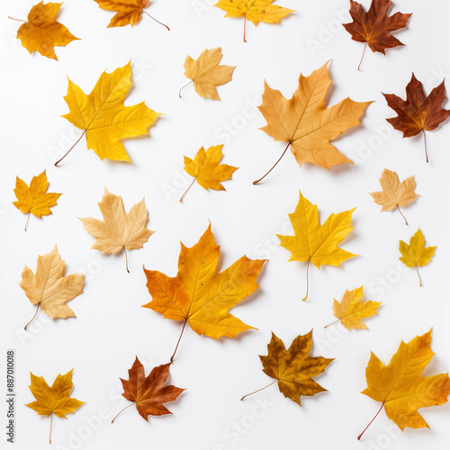 © Roman, Fototapeta premium A collection of yellow and brown leaves scattered across a white background