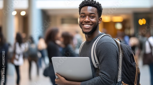 Fototapeta premium A college student with a backpack and a laptop smiling at the camera