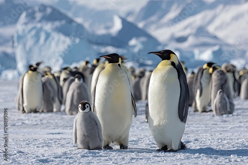 © wahyuni, Fototapeta premium A colony of Emperor penguins, adults and chicks, standing on a snowy Antarctic landscape