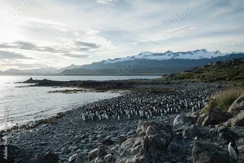 © Nico, Fototapeta premium A colony of Magellanic penguins huddled together on a rocky shore in Patagonia.