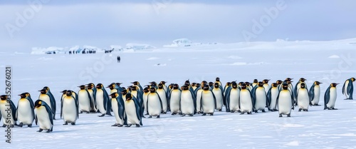 Obraz premium A colony of penguins waddles across a vast, icy landscape, frozen, Arctic