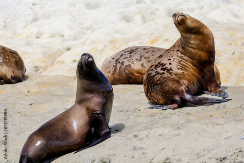 Naklejka premium A colony of sea lions along the beaches of Puerto Madryn, Argentina