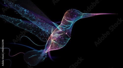© Soklin, Fototapeta premium A colorful, abstract hummingbird design with a black background, featuring a mix of blue, purple, and pink hues.