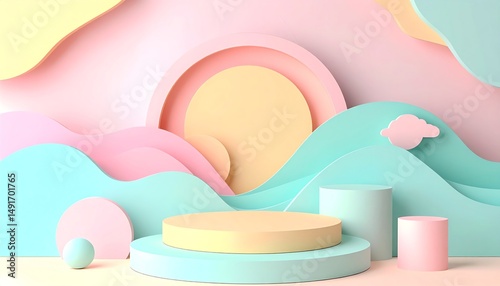 © Pastel, Fototapeta premium A colorful abstract landscape featuring layered geometric shapes in pastel hues, evoking a playful and serene atmosphere