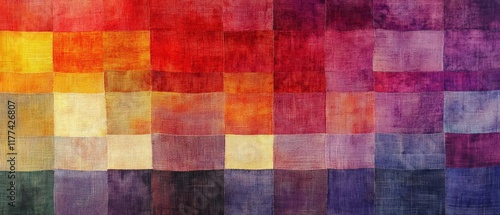 Fototapeta premium a colorful abstract pattern of patchwork squares in reds, purples, and yellows
