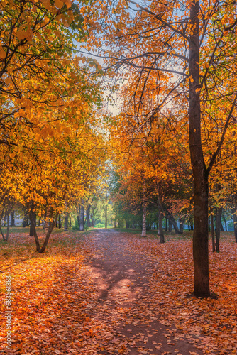 Fototapeta premium A colorful alley, a path for walking in the autumn park among the trees.