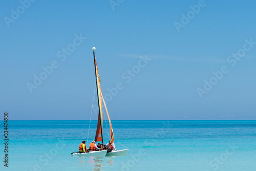 © marcos, Naklejka premium a colorful and beautiful catamaran sails the turquoise blue waters with tourists in the clear waters of cuba