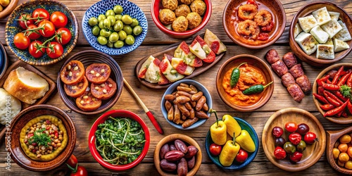 Fototapeta premium A colorful and diverse spread of traditional Spanish tapas , Tapas, Spanish,...