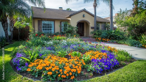 © Sampao, Fototapeta premium A colorful and tidy flower bed featuring petunias, pansies, and marigolds, arranged neatly beside a stylish home.