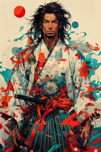 © Tungbackground, Fototapeta premium A colorful anime-style illustration of a mystical healer with a staff, wearing natural robes.