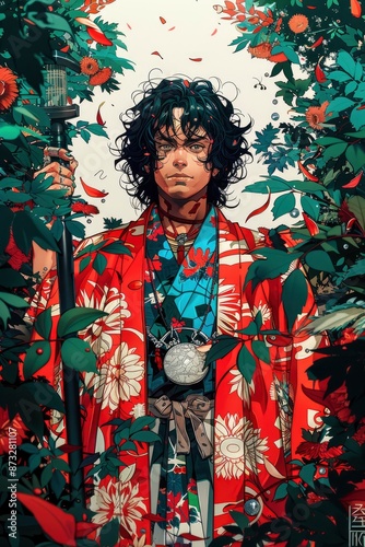 © Tungbackground, Fototapeta premium A colorful anime-style illustration of a mystical healer with a staff, wearing natural robes.