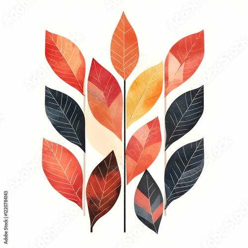 © Wilis Land, Obraz premium A colorful arrangement of stylized leaves in various shapes and shades.