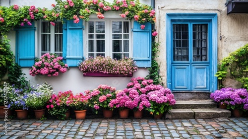 Naklejka premium A colorful array of flowers arranged around a cobblestone courtyard, with a French-style home in the backdrop.