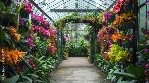 © Prostock-studio, Naklejka premium A colorful array of orchids fills the greenhouse, creating a stunning pathway lined with lush foliage and vibrant blooms.
