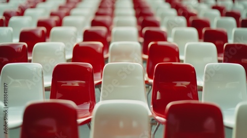 Fototapeta premium A colorful array of red and white chairs arranged in a repetitive, orderly pattern, highlighting the theme of uniformity and design.