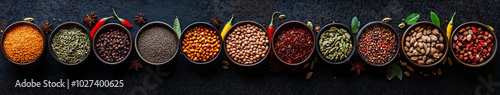 Fototapeta premium A colorful array of spices and herbs arranged in small bowls, including cumin...