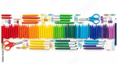 Obraz premium A colorful array of stationery supplies arranged in a spectrum.