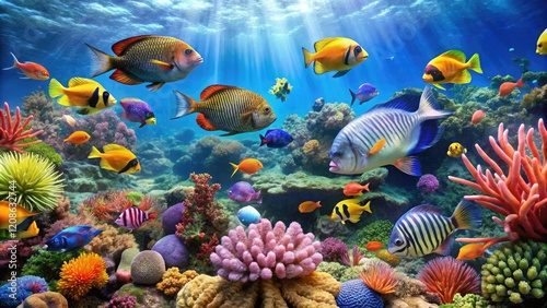 Naklejka premium A colorful array of tropical fish swimming in an underwater coral reef,...