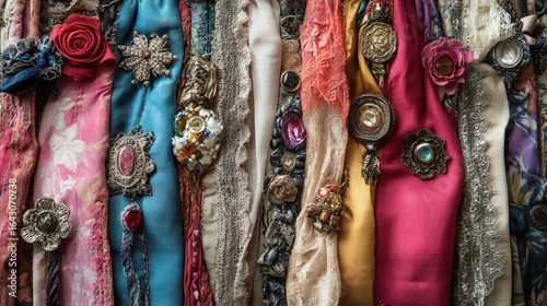 © Adip, Naklejka premium A colorful assemblage of fabric strips adorned with decorative embellishments.