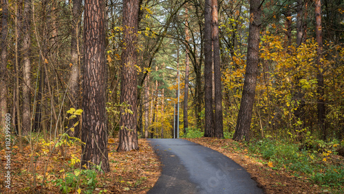 Fototapeta premium A colorful autumn city park with an asphalt walking path among the trees. The...