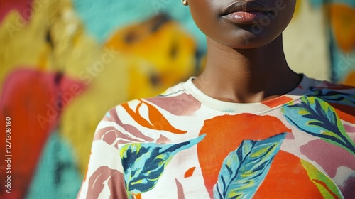 Fototapeta premium A colorful backdrop frames a person wearing a floral-patterned shirt, showcasing vibrant self-expression through fashion and public art.