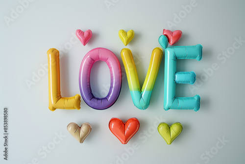 © SJ Studio, Naklejka premium A colorful balloon bouquet with the word LOVE written in the middle
