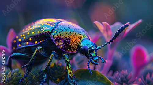 Fototapeta premium A colorful beetle is walking on a field of flowers.