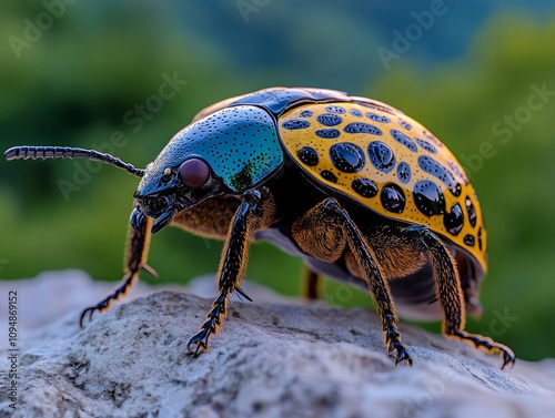 © VISUAL BACKGROUND, Fototapeta premium A colorful beetle sitting on top of a rock