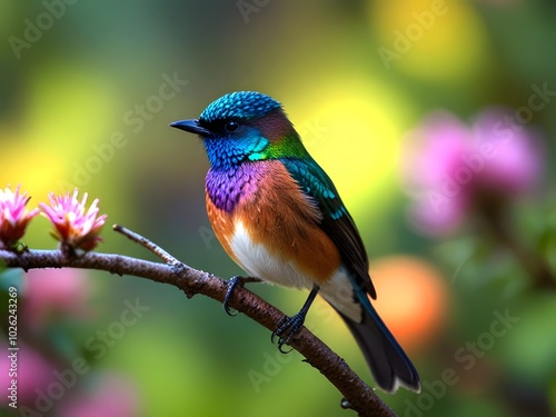 © designer master 06, Fototapeta premium A colorful bird sits on a branch in the forest.