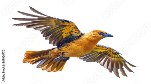 © MONWARA, Fototapeta premium A colorful bird with a long tail is flying in the air isolated on a white background
