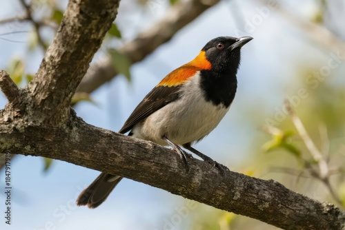 Fototapeta premium A colorful bird with black, white, and orange plumage perched on a tree...