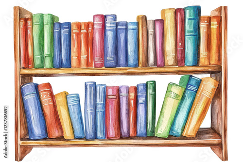 Naklejka premium A colorful bookshelf filled with various books arranged neatly on two wooden...