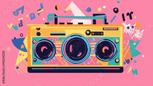 Fototapeta premium A colorful boombox sits in the center, surrounded by neon musical notes and geometric patterns, evoking a lively, retro vibe