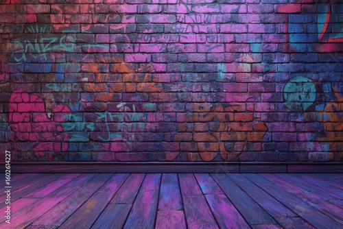 © Alohanongza, Fototapeta premium A colorful brick wall covered in graffiti art, with vibrant purple, blue, and orange lights reflecting on a wooden floor